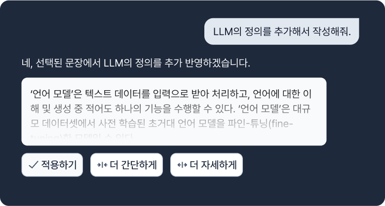 - 특정 문단을 선택해 “이 부분을 더 보강해줘”와 같이 요청하면, AI 비서가 바로 결과를 반영합니다.